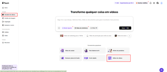 Abra o Pippit e faça login para acessar o workspace. No menu à esquerda, selecione a seção “Gerador de vídeos” e depois abra o “Editor de vídeos”.