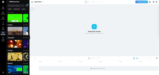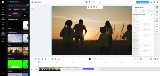Adicione seu material enviando o arquivo ou simplesmente arrastando e soltando. Se não tiver nenhum clipe à mão, escolha uma opção de banco de vídeos dentro da área “Elementos”. Esse ambiente já deixa tudo pronto para começar a corrigir a exposição.