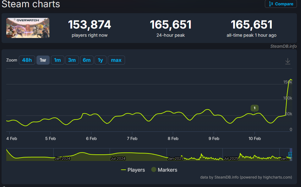 O Overwatch registrou um novo pico histórico de jogadores simultâneos na Steam nesta semana. Segundo dados do SteamDB, o hero shooter alcançou 165.651 jogadores simultâneos, superando todas as marcas anteriores na plataforma.