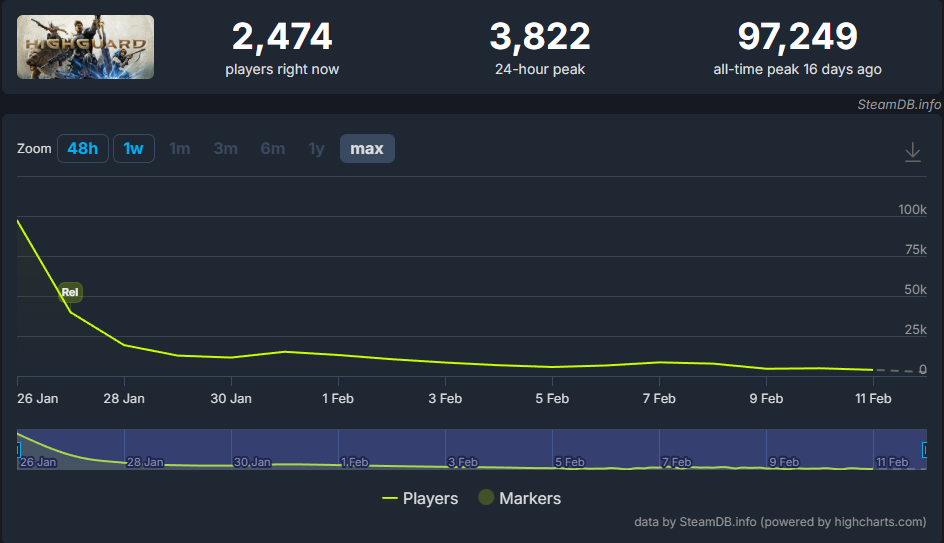 O cenário se torna ainda mais preocupante quando analisamos os números recentes. Conforme os dados públicos da Steam, Highguard registrou um pico histórico de 97 mil jogadores simultâneos há pouco mais de duas semanas. No entanto, o título viu sua base ativa despencar rapidamente.