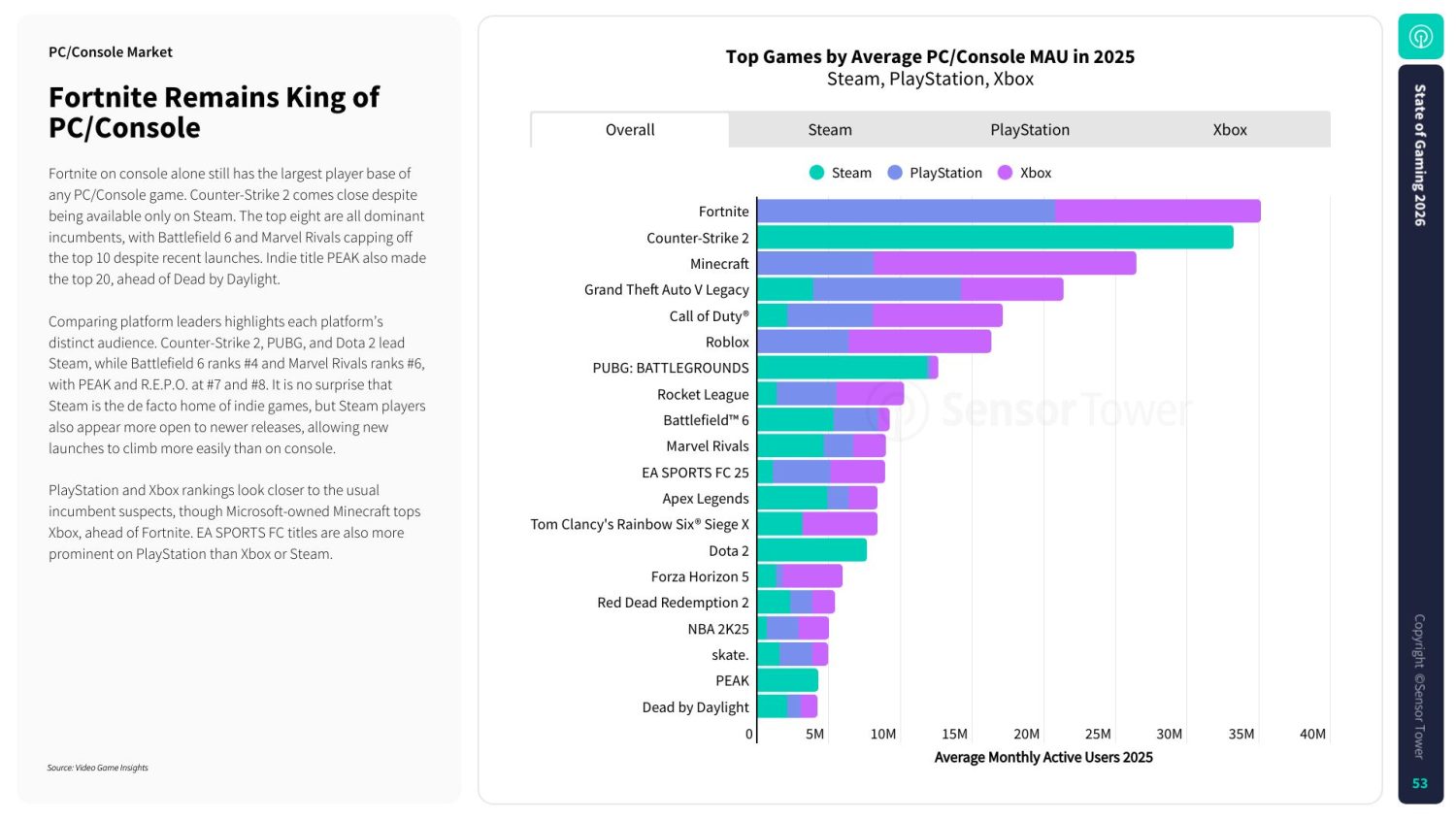 No ranking por empresa, a Microsoft ocupa o primeiro lugar em gastos totais com anúncios para PC e consoles, muito possivelmente impulsionados pela campanha “Isto é um Xbox“, que contou com várias celebridades. O investimento supera com folga o de concorrentes diretas. A Take-Two Interactive aparece na segunda posição, seguida por Electronic Arts. Logo atrás estão Epic Games e Tencent.